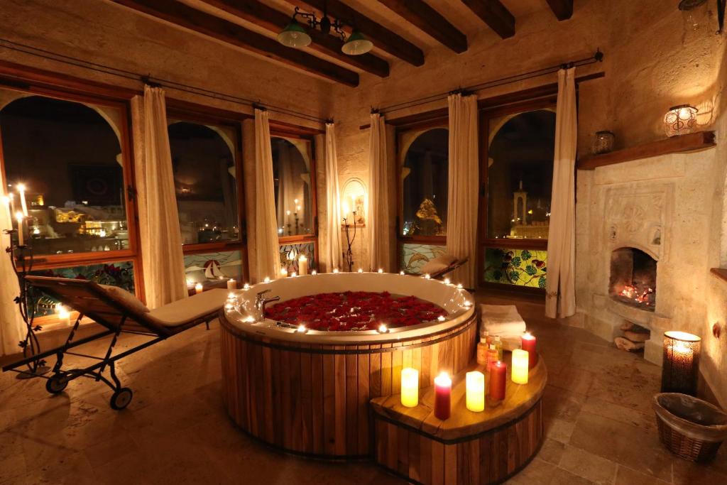 En este hotel, las habitaciones están construidas en las formaciones rocosas típicas de la región, ofreciendo una experiencia local sin renunciar al confort. Todas las habitaciones cuentan con aire acondicionado, calefacción, Wi-Fi gratuito, caja fuerte, minibar y camas espaciosas. El desayuno se sirve en la terraza panorámica, con pan fresco, quesos, frutas y platos tradicionales turcos. El hotel también organiza excursiones por la región, como paseos en globo y recorridos por los valles. La tarifa por noche para dos personas es de aproximadamente 309 €, con desayuno incluido.
