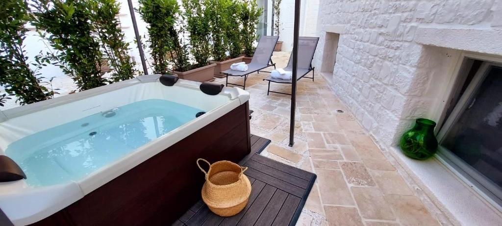 Mirum Apuliae is located just a short 5–10-minute walk from the center and the trulli. It offers rooms and a small renovated studio with air conditioning, small kitchenettes/coffee machines in some units, and pleasant outdoor spaces (garden/terrace). The atmosphere is simple and welcoming, more like a guesthouse than a large hotel. Some listings even mention a small hot tub or bathtub in certain units and shared areas for relaxation. Guests often highlight the excellent location and cleanliness as major positives.