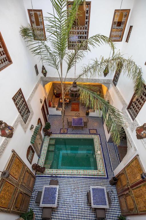 This 4-star riad is located in the heart of Marrakech’s medina, just a few minutes from Jemaa el-Fna square. Rates for two people start at around €50, and the hotel has a solid rating of 8.5. Guests highlight the welcoming atmosphere, friendly staff, and the beauty of the inner courtyard. It offers a spa, hammam, rooftop terrace with city views, indoor pool, restaurant, and air-conditioned rooms with traditional Moroccan décor. A great choice for those who want to experience local life with comfort and tranquility.